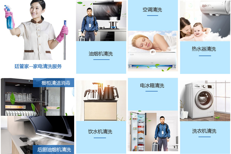 廷管家服務(wù)項(xiàng)目包含油煙機(jī)清洗、空調(diào)清洗、熱水器清洗、飲水機(jī)清洗等多項(xiàng)家電清洗業(yè)務(wù),安全便捷又放心!